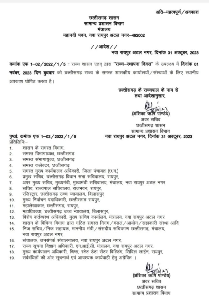 रायपुर/ राज्य शासन ने ‘राज्य स्थापना दिवस’ के उपलक्ष्य में एक नवंबर को छत्तीसगढ़ राज्य के समस्त शासकीय कार्यालयों एवं संस्थाओं के लिए स्थानीय अवकाश घोषित किया है। राज्य शासन के सामान्य प्रशासन विभाग द्वारा आज मंत्रालय महानदी भवन नवा रायपुर से इस आशय का आदेश जारी किया गया।