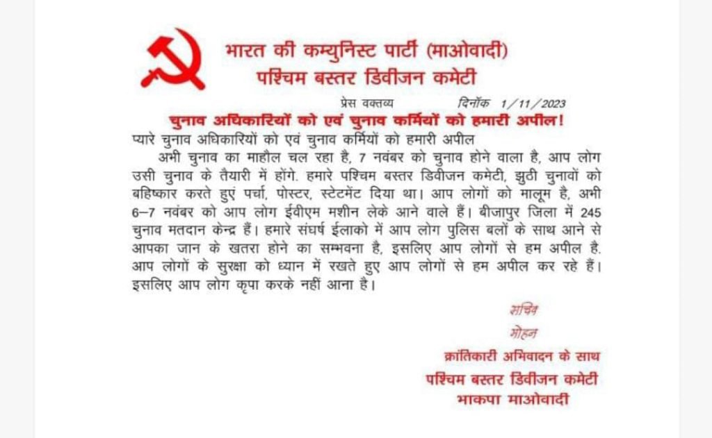 6 -7 नवंबर को ईवीएम मशीन लेकर आने वाले अधिकारी कर्मचारियों को माओवादी नेता की ओर से अपील