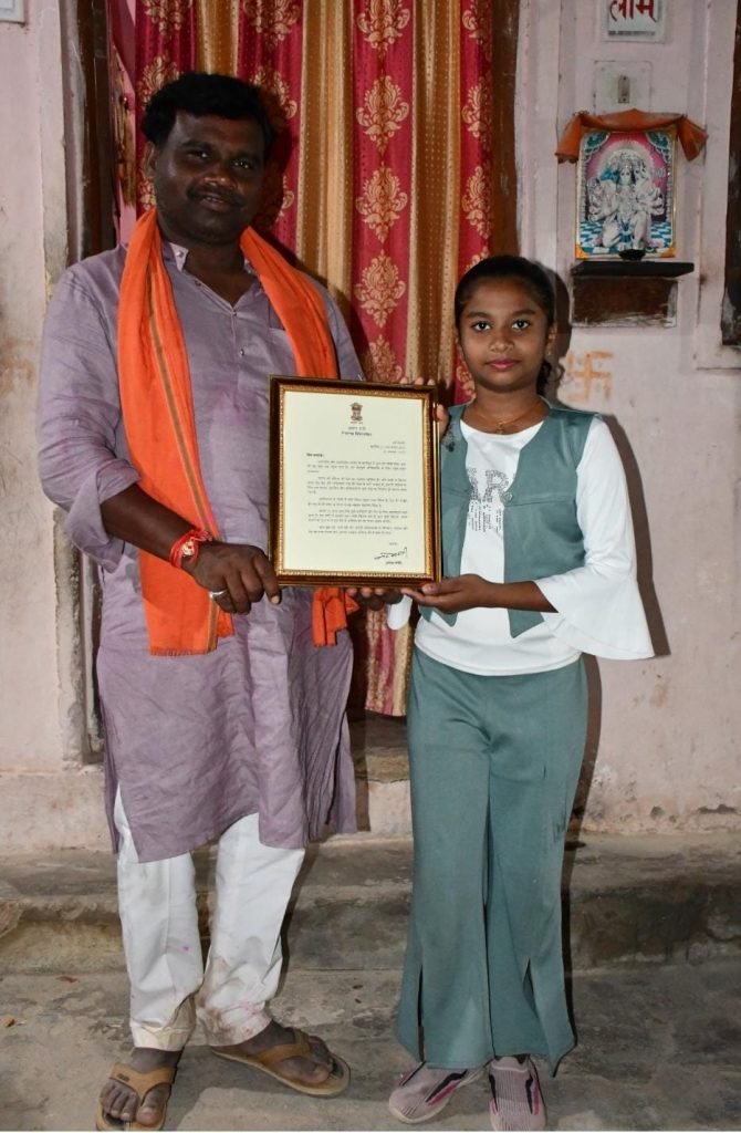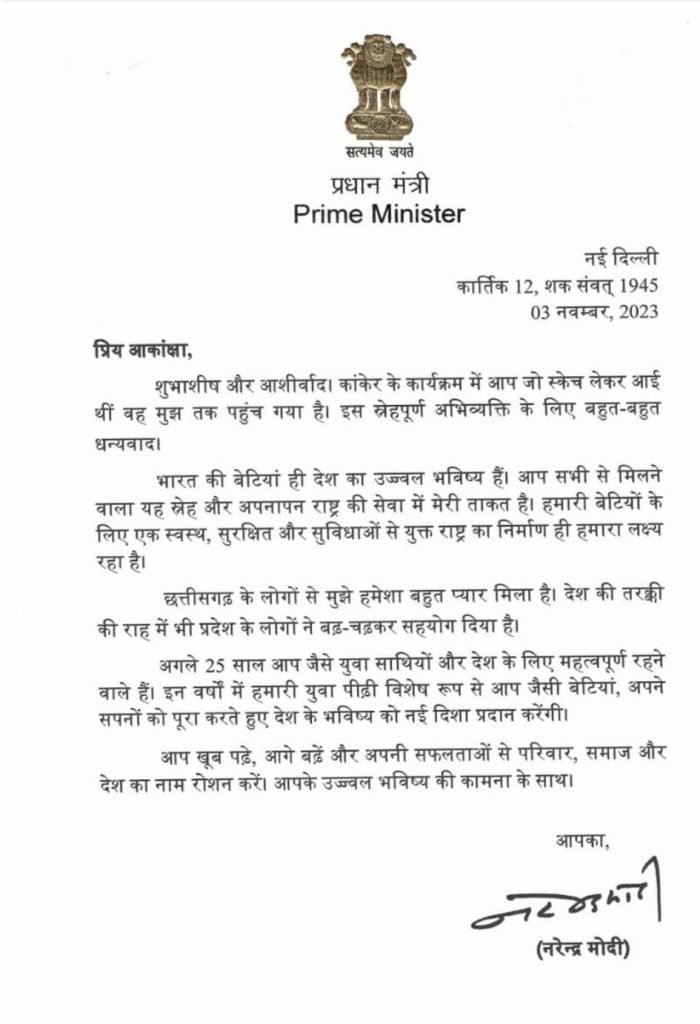 कांकेर/ कांकेर में विजय संकल्प महारैली में विशाल जनसभा को संबोधित करते पीएम नरेंद्र मोदी का ध्यान एका एक 10 वर्षीय बालिका के हाथो में अपनी तस्वीर का स्कैच देखकर अभिभूत होते हुए बालिका को जमकर आशीर्वाद दिया और चिट्ठी लिखने की बात कही थी और अब बालिका को उनकी चिट्ठी मिल गई है पीएम मोदी ने बच्ची से वादा किया था की वे बालिका को चिट्ठी लिखेंगे और अब उनकी चिट्ठी बच्ची को मिल गई है पीएम मोदी ने उक्त बालिका आकांक्षा को सम्बोधित करते हुए उन्होने लिखा है कि प्रिय आकांक्षा, शुभाशीष और आशीर्वाद