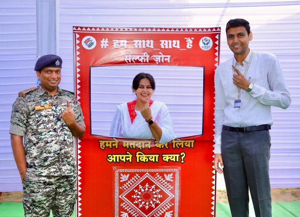 कांकेर, 07 नवम्बर 2023/ एवं जिला निर्वाचन अधिकारी डॉ. प्रियंका शुक्ला, एसपी श्री दिव्यांग पटेल और जिला पंचायत के सीईओ श्री सुमित अग्रवाल ने आदर्श मतदान केंद्र माहुरबंदपारा में वोट देकर अपने मताधिकार का प्रयोग किया। इस अवसर पर सभी अधिकारियों ने सेल्फी कॉर्नर और “हम साथ साथ हैं” फ़ोटो कॉर्नर में एक साथ तस्वीर भी खिंचाई और सभी वोटर्स को मतदान अवश्य करने का संदेश भी दिया।