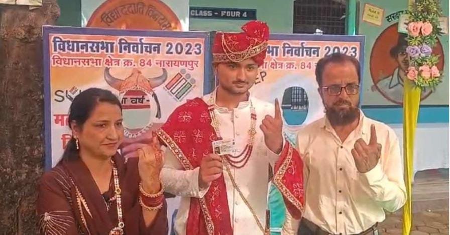 नारायणपुर के बालक प्राथमिक शाला में उस समय मतदाताओं में आश्चर्य का ठिकाना नहीं रहा, जब उन्होंने शादी के जोड़े में दूल्हे को वोट देने के लिए केंद्र में आते हुए देखा. अपने माता-पिता के साथ मतदान करने पहुंचे दूल्हे के साथ लोग सेल्फी लेते नजर आए.