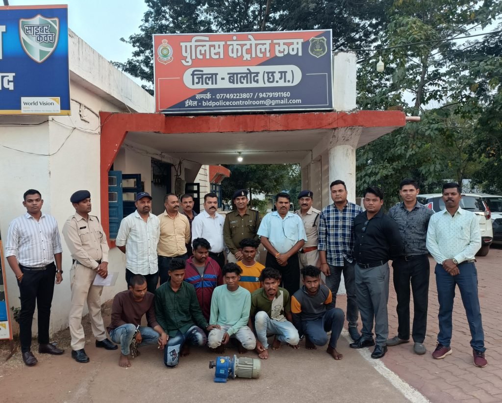 बालोद क्षेत्र के ग्राम झलमला के सूने मकान , संजय नगर बालोद के मकान व ग्राम कोरगुडा के ईट फैक्ट्री में हुए चोरी के अज्ञात आरोपियो की पतासाजी हेतू थाना प्रभारी बालोद निरीक्षक श्री रविषंकर पाण्डेय व साइबर सेल बालोद प्रभारी उपनिरीक्षक श्री जोगेन्द्र साहू के नेतृत्व में साइबर सेल व थाना से एक विषेष टीम गठित कर अज्ञात आरोपियो के पतासाजी हेतु लगाया गया था। साथ ही घटना स्थल पर डॉग स्क्वाड की टीम और फिंगर पिं्रट टीम द्वारा चोरी के साक्ष्य का विष्लेषण किया गया। जिस पर 03 प्रकरणों में कुल 07 आरोपियो को इलेक्ट्रीक मोटर पंप , नगदी रकम सहित 14200/- रूपये व लाखो के सोने, चांदी के जेवरात सहित गिरफ्तार किया गया है।