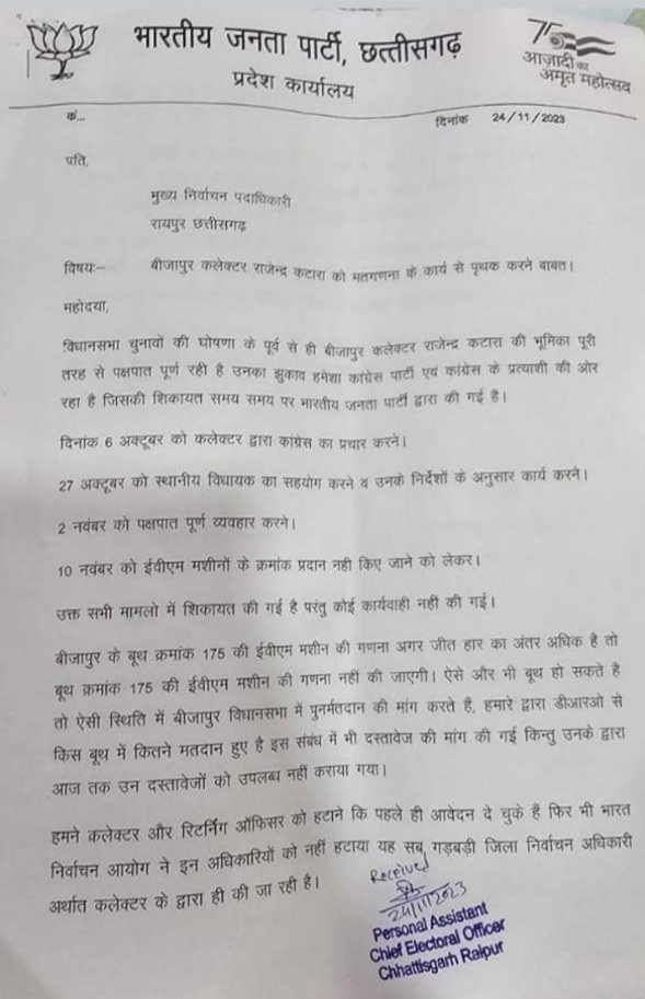 बीजापुर कलेक्टर गड़बड़ी कर सकता है इस पत्र की शिकायत से स्प्ष्ट है ।। आप ईव्हीएम नम्बर देने से इंकार कर रहे हो आप किस बूथ पर कितना मतदान हुआ उसकी जानकारी नही दे रहे हो जबकि कलेक्टर एवं जिलानिर्वाचन अधिकारी को बूथ में इस्तमाल की गई ईव्हीएम नम्बर सहित किस बूथ पर कितनी मतदान हुआ उसकी सारी जानकारी प्रत्यशियों को देना होता है ।। भाजपा लिखित में जानकारी मांगने के बाद भी कलेक्टर एवं जिलानिर्वाचन अधिकारी राजेन्द्र काटारा देने से इंकार कर रहे है मतलब साफ है कि वो कांग्रेस को फायदे के लिए गड़बड़ी कर सकते है