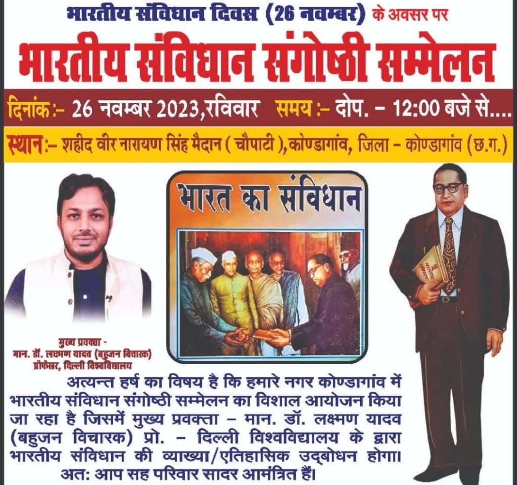 कोंडागांव जिला मुख्यालय अंतर्गत स्थानीय चौपाटी मैदान स्थित सर्व आदिवासी भवन में 26 नवंबर को बृहद रूप से संविधान दिवस कार्यक्रम का आयोजन किया जा रहा है। इस अवसर पर बाबा साहब सेवा संस्था कोंडागांव के द्वारा भारतीय संविधान संगोष्ठी का विशाल सम्मेलन आयोजित किया गया है। जिसमे मुख्य प्रवक्ता के रूप में दिल्ली विश्वविद्यालय के प्रोफेसर डॉ लक्ष्मण यादव द्वारा संविधान की व्याख्या की जाएगी। जिसमे कोंडागांव जिला सहित बस्तर संभाग से सैकड़ों पदाधिकारी शामिल होंगे। इस कार्यक्रम को सफल बनाने हेतु बाबा साहब सेवा संस्था कोंडागांव एवं सर्व आदिवासी समाज के पदाधिकारियों ने बड़ी संख्या में जिले वासियों को शामिल होने की अपील की है।