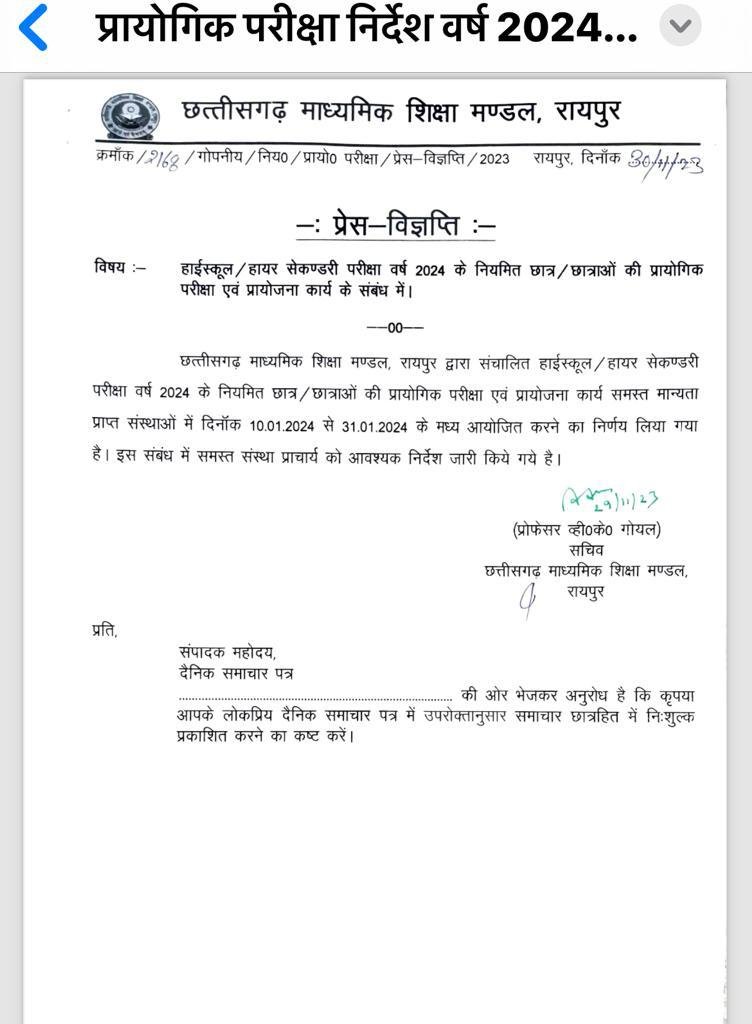 ब्रेकिंग न्यूज़ दसवीं बारहवीं के प्रयोगिक परीक्षा के लिए तिथि जारी Express MPCG Dec 1, 2023 0 रायपुर दसवीं बारहवीं के प्रयोगिक परीक्षा के लिए तिथि जारी 10 दिंसबर से 31 दिंसबर तक प्रयोगिक परीक्षा करने का निर्णय सभी स्कूलो को निर्देश जारी माशिमं के सचिव प्रोफेसर वीके गोयल ने जारी किए आदेश
