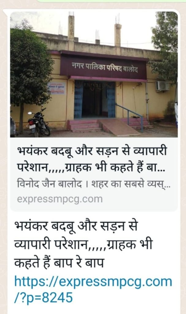 बालोद नगर पालिका क्षेत्र अंतर्गत घड़ी चौक में निर्मित व्यावसायिक काम्पलेक्स के सामने बने नाली से उठने वाली बदबू का खबर प्रकाशन किया गया था जिसके बाद नगर पालिका प्रशासन ने इसे गंभीरता से लेते हुए त्वरित कार्यवाही कर नालियों की सफाई कराई गई एवं ब्लीचिंग पावडर भी डाला गया यहां संचालित होटलो के झूठन का नाली में जाना एवं नालियों में पानी निकासी सही नही होने के कारण यहां बदबू उठने लगी थी जिसके कारण आसपास के व्यवसायी एवं ग्राहकों में रोष व्याप्त था साफ सफाई नही होने के कारण गंदगी और बदबू आने लगी थी खबर प्रकाशित होने के बाद साफ सफाई कराई गई है जिससे फिरहाल बदबू कम आ रहा है