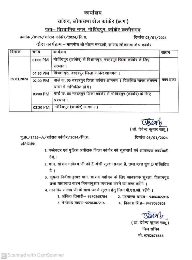 नरहरपुर. नगर के वार्ड क्रमांक 05 गांधी चौक में 9 जनवरी को दोपहर 2 बजे से विकसित भारत संकल्प यात्रा शिविर का आयोजन किया गया है। जिसकी तैयारी नगर पंचायत द्वारा की जा रही है। इस यात्रा का उद्देश्य पात्र लाभार्थियों को केंद्र सरकार की योजनाओं के बारे में जागरूक करना और नई योजनाओं के माध्यम से उनको लाभ पहुंचाना है। विकसित भारत संकल्प यात्रा में कांकेर लोकसभा के सांसद मोहन मंडावी व कांकेर विधायक आशाराम नेताम शामिल होंगे। उनके साथ स्थानीय जनप्रतिनिधि भी शामिल होंगे।