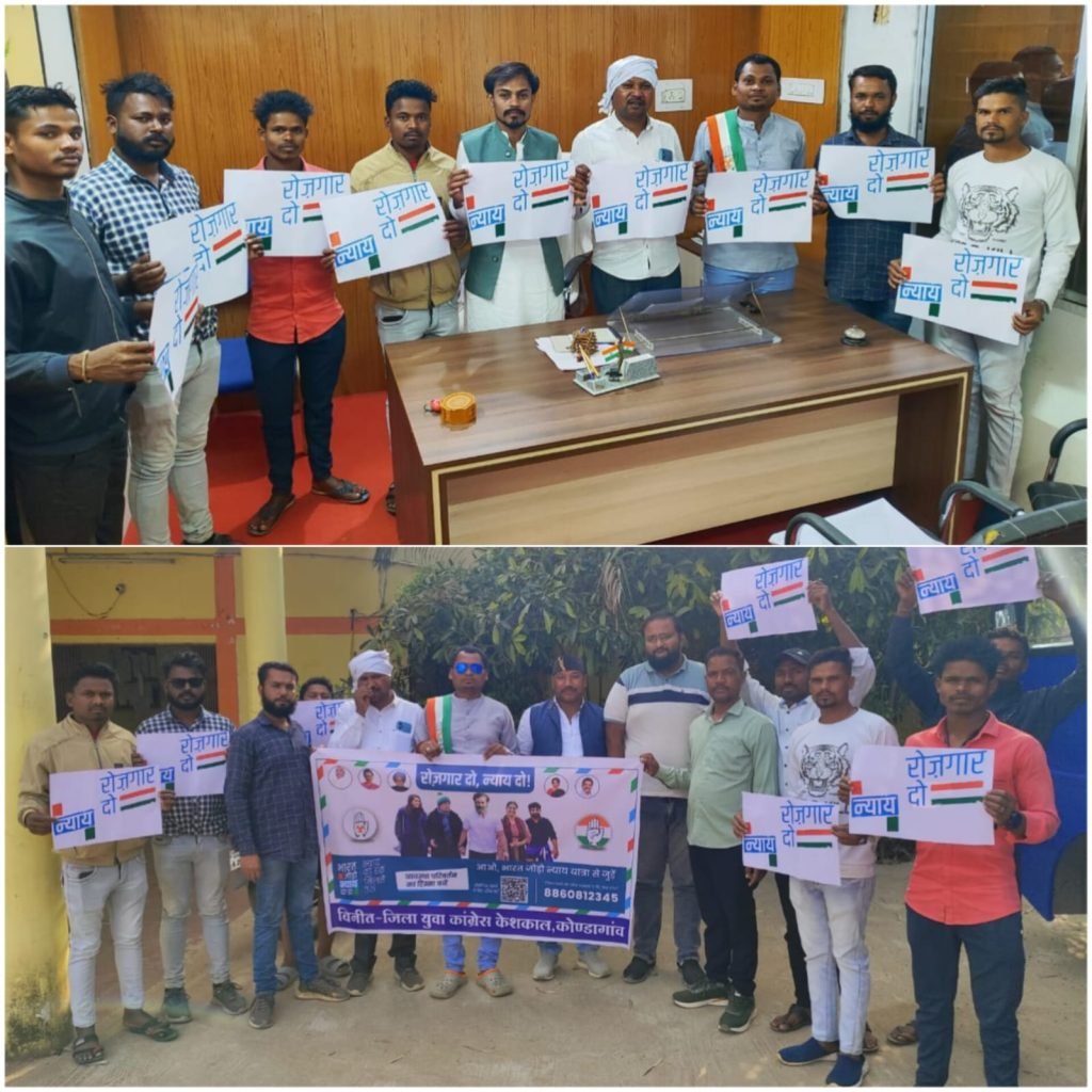 केशकाल – छत्तीसगढ़ प्रदेश युवा कांग्रेस के निर्देशानुसार पर कोण्डागाँव जिला युवा कॉंग्रेस के द्वारा केशकाल में ब्लाक कांग्रेस कमेटी के अध्यक्ष एवं जनपद पंचायत के अध्यक्ष की उपस्थिति में कोण्डागाँव युवा कांग्रेस के जिला अध्यक्ष पिताम्बर नाग के नेतृत्व में आज ‘रोजगार दो,न्याय दो’ पोस्टर का विमोचन किया ।