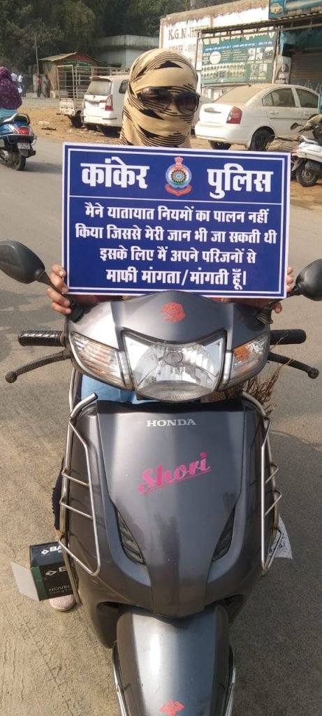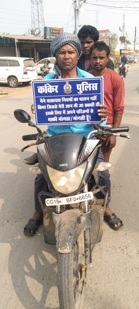 कांकेर जिले में बढ़ती हुई सड़क दुर्घटनाओं को देखते हुये कांकेर पुलिस द्वारा 34 वॉ राष्ट्रीय सड़क सुरक्षा माह के अवसर पर पुलिस अधीक्षक ने “SAY SORRY TO YOUR FAMILY” अभियान के तहत वाहन चालक के मोबाईल से फोटो खींचकर उसके वाट्सअप से उसके 05 परिजनो को भेजा जा रहा है जिसके अंतर्गत दिनांक 16.01.2024 को 1907 वाहन चालकों के 9535 परिजनों/मित्रों को तथा दिनांक 17.01.2024 को 3003 वाहन चालकों के 15009 परिजनों/मित्रों को वाट्सअप से मैसेज भेजा गया। इस प्रकार 02 दिवस की कार्यवाही में कुल 4910 वाहन चालकों का उनके ही मोबाईल से फोटो खींचकर उनके कुल 24544 परिजनों/मित्रों को वाट्सअप के माध्यम से मैसेज भेजा गया तथा उक्त वाहन चालकों को यातायात नियमों का पालन करने के संबंध में समझाईश दिया गया।