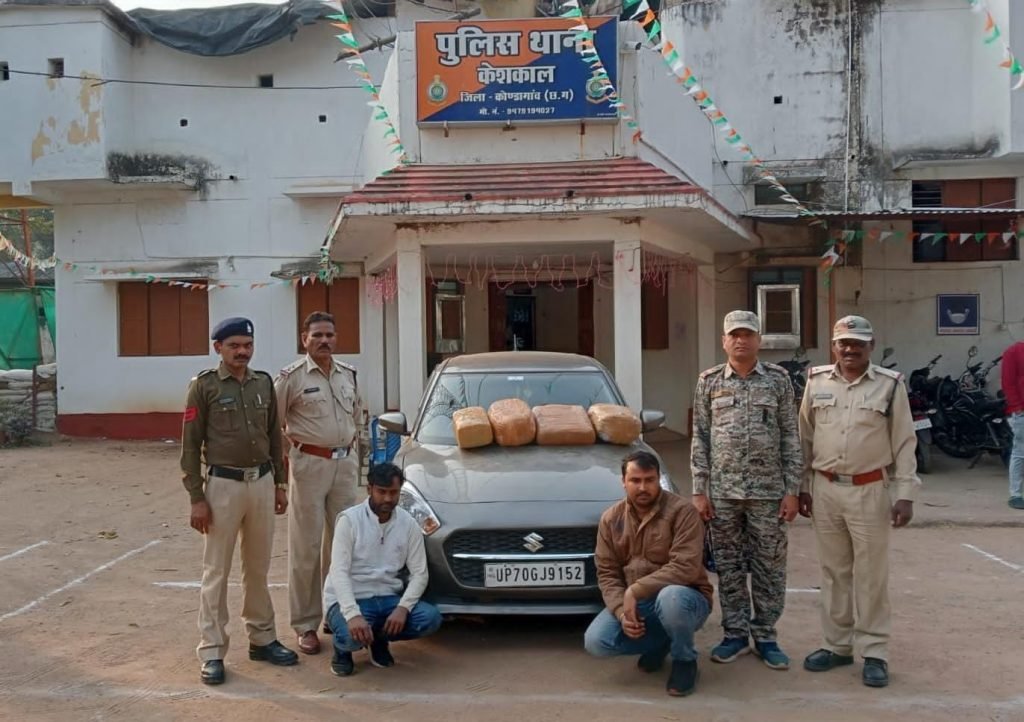 कोंडागांव में पुलिस अधीक्षक वाय. अक्षय कुमार के निर्देशन में केशकाल पुलिस के द्वारा लगातार अवैध मादक पदार्थों के विरुद्ध कार्यवाही की जा रही है इसी तारतम्य में आज 26 जनवरी को केशकाल पुलिस को सूचना प्राप्त हुई की एक ग्रे कलर का स्वीफ्ट डिजायर कार कमांक UP-70-GJ- 9152 में कुछ लोग अवैध मादक पदार्थ गांजा छिपा कर उड़िसा से रायपुर की ओर जगदलपुर केशकाल के रास्ते से जाने वाले है। कि सूचना पर कैम्प दादरगढ़ के सामने एन. एच. 30 पर नाके बंदी कर संदिग्ध वाहन का इंतजार किया, मुखबीर के बताये अनुसार स्वीफ्ट डिजायर कार कमांक UP-70-GJ-9152 में अवैध मादक पदार्थ गांजा को बिकी करने हेतु अपने डिक्की के अंदर भरकर रखा हुआ भूरे रंग के सेलोटेप से पैक किया हुआ 04 पैकेट अवैध मादक पदार्थ गांजा कुल वजन 23.115 किलोग्राम गांजा कीमत करीबन 2 लाख 31 हजार 1 सौ 50 रूपये एवं ग्रे कलर का स्वीफ्ट डिजायर कार कमाक UP-70-GJ-9152 कीमती लगभग 6 लाख, कुल 831150 ( आठ लाख इकतीस हजार एक सौ पचास) रुपए को बरामद कर आरोपी मनीष पाण्डेय पिता बाबूलाल पाण्डेय जाति ब्राम्हण उम्र 29 वर्ष निवासी ग्राम शिवपुर पाण्डेनपुरवा शारदा माई मंदिर के सामने पोस्ट चौखण्डी थाना पनवार तह० जवा जिला रीवा (मध्य प्रदेश) और अवनीश सिंह पिता स्व. सरदार सिंह जाति सिंगरोलिया उम्र 28 वर्ष निवासी ग्राम चम्पतपुर प्राथमिक स्कूल के पिछे तह० करछना पोस्ट बगबना थाना घोरपुर जिला प्रयागराज (उत्तर प्रदेश) के विरूद्ध एनडीपीएस एक्ट के तहत कार्यवाही कर गिरफ्तार किया गया।