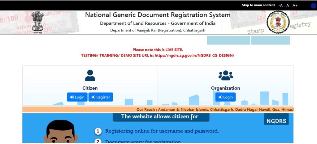 एनजीडीआरएस प्रणाली में दस्तावेज के पंजीयन हेतु पक्षकार को वेबसाईट https://www.ngdrs.cg.gov.in/NGDRS_CG पर जाकर सर्वप्रथम पंजीयन करने के उपरान्त दस्तावेज का विवरण भरकर पंजीयन कार्यालय को ऑनलाईन आवेदन समिट करते हुए अपाॅइंटमेंट प्राप्त करना होगा। तथा आवेदक पक्षकार निर्धारित तिथि को दस्तावेज एवं सभी आवश्यक अभिलेखों सहित पंजीयन कार्यालय में उपस्थित होकर अपने दस्तावेज का पंजीयन कर सकते हैं।